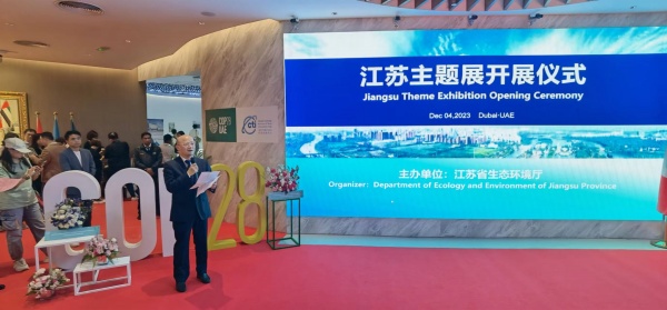 发布日期:2023-12-07 21:13 来源:省生态环境监测监控有限公司 字体:[ 大 中 小 ] 近日,第28次《联合国气候变化框架公约》缔约方大会(COP28)于阿联酋迪拜举行。大会期间,中国代表团在迪拜世博城以“绿色低碳发展实践”为主题,举办了“中国角”江苏专场活动,旨在向世界展示与分享江苏各级政府、社会各界在应对气候变化中的行动与落实,加快推进中国式现代化江苏新实践。江苏省生态环境厅主办了江苏专场活动,江苏省环保集团副总经理、党委委员陆继根应邀出席江苏主题展。