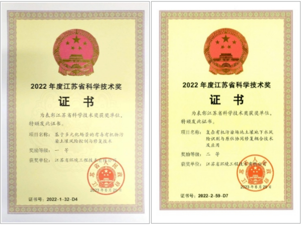 发布日期:2023-12-25 23:49 来源:省环境工程技术有限公司 字体:[ 大 中 小 ] 近日,省环保集团所属省环境工程技术有限公司获颁2项江苏省科学技术奖荣誉证书。研究成果“基于多元化场景的有毒有机物污染土壤风险控制与修复技术”荣获江苏省科学技术奖一等奖,是本年度唯一获得该级别奖励的省属企业;研究成果“复杂有机污染场地土壤地下水风险识别与原位协同修复耦合技术及应用”荣获江苏省科学技术奖二等奖。