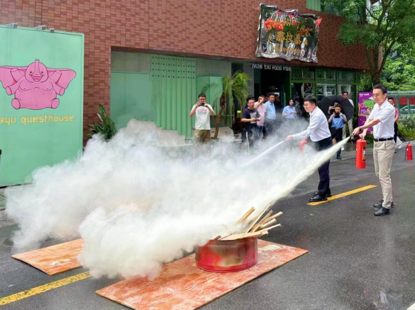 在灭火器实操演练中,各单位员工在消防队员的专业讲解下,了解正确使用干粉灭火器的方法步骤,并对现场设置的小型模拟火堆进行灭火实操演练。演练人员迅速拔掉保险销,拉出喷射软管,对准火源进行喷射,成功扑灭了模拟火灾。