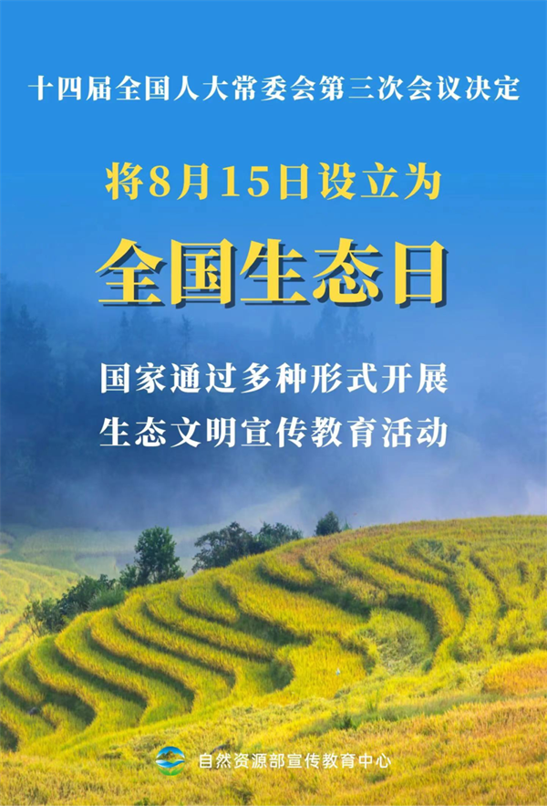 今年6月28日,十四届全国人大常委会第三次会议通过了《全国人民代表大会常务委员会关于设立全国生态日的决定》,将8月15日设立为全国生态日,并规定国家通过多种形式开展生态文明宣传教育活动。