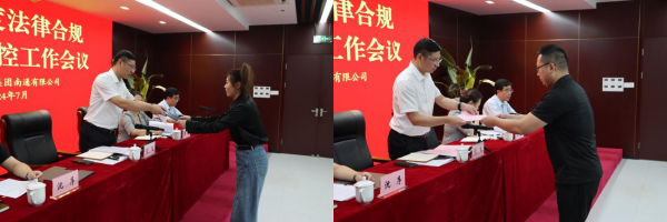会中,南通公司主要负责人向公司内部法律顾问颁发了聘书并带头签署合规承诺书,各部门及国盛公司负责人递交了承诺书。