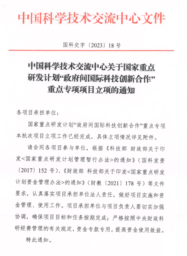 发布日期:2023-09-04 21:31 来源:省环境工程技术有限公司 字体:[ 大 中 小 ]近日,科技部中国科学交流中心发布了2023年《重点研发计划“政府间国际科技创新合作”重点专项项目立项通知》,江苏省环保集团所属省环境工程技术有限公司联合南京扬子江生态文明创新中心、新加坡南洋理工大学、南京大学、南京工业大学、中日友好环境保护中心和国家先进印染技术创新中心等单位申报的2023年国家重点研发计划“工业有机废水治理与资源化中新协同创新中心”项目正式获批。南京扬子江生态文明创新中心为牵头单位、新加坡南洋理工大学为外方合作单位。