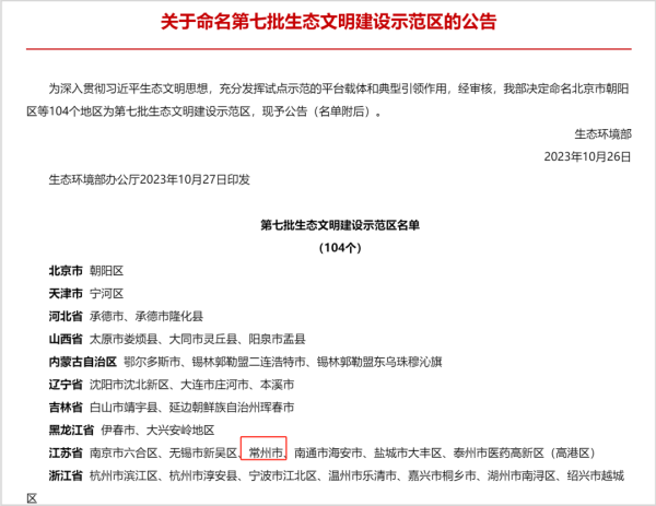 发布日期:2023-11-04 16:58 来源:江苏中吴环保产业发展有限公司 字体:[ 大 中 小 ]近日,在中国生态文明论坛济南年会开幕式上,生态环境部为第七批104个国家生态文明建设示范区授牌,常州市成功上榜“国字号”。该创建项目由省环保集团中吴公司所属常环公司协助常州市生态环境局完成申报,常州市是江苏省今年唯一一个创成的地级市。