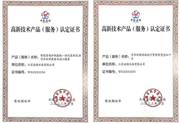 江苏启德水务有限公司两项产品获无锡市高新技术产品(服务)认定