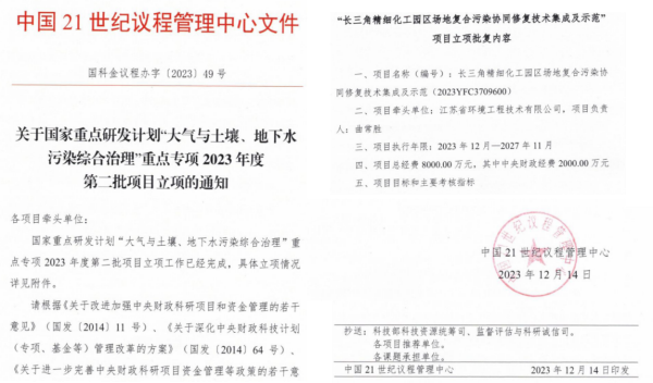 发布日期:2024-01-04 21:06 来源:省环境工程技术有限公司 字体:[ 大 中 小 ]近日,中国21世纪议程管理中心印发立项通知,省环保集团所属省环境工程技术有限公司牵头申报的国家重点研发计划“大气与土壤、地下水污染综合治理”重点专项项目“长三角精细化工园区场地复合污染协同修复技术集成及示范”正式获批立项,实施周期4年,总经费8000万元,其中国拨经费2000万元。该项目系国家2015年设立重点研发计划以来,首个由江苏省属企业牵头的项目,也是2023年度“大气与土壤、地下水污染综合治理”重点专项中,全国范围内唯一由地方企业牵头的项目,代表着环保集团创新驱动战略的落地见效和组织科研攻关能力的显著提升。