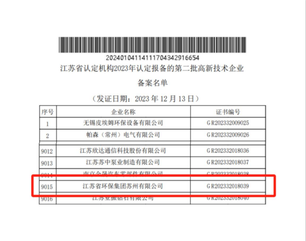 喜报丨省环保集团苏州有限公司通过2023年度国家高新技术企业认定