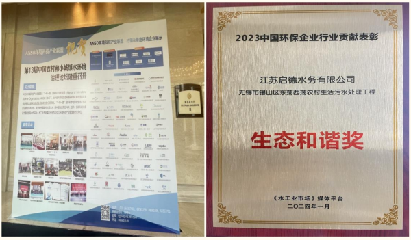 喜报丨江苏启德水务有限公司获2023年中国环保企业行业贡献表彰“生态和谐奖”