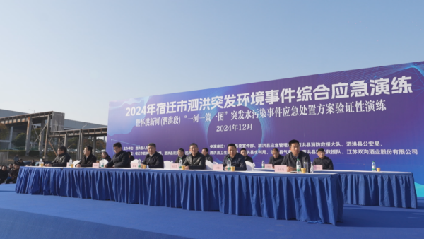 演练模拟某酒厂因设备故障,储酒罐区一处原酒储罐发生泄漏并引发火灾。在紧急处置过程中,由于雨水阀门损坏,泄漏的原酒与消防废水一同流入怀洪新河(泗洪段),严重威胁到下游水质安全及沿岸生态环境。