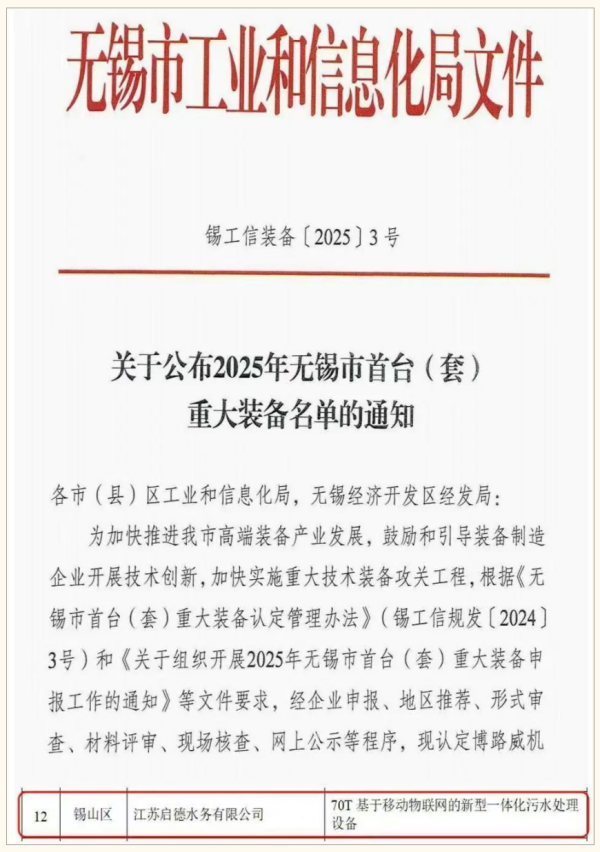 发布日期:2026-01-09 21:26 来源:江苏环保产业股份有限公司 字体:[ 大 中 小 ]近日,无锡市工业和信息化局公布了2025年度市级首台(套)重大装备名单,省环保集团产业公司所属江苏启德水务有限公司的“70T基于移动物联网的新型一体化污水处理设备”成功入选,这一认定不仅是对该产品技术创新性与市场应用价值的权威认可,更是对公司在环保装备领域自主研发实力的充分肯定。