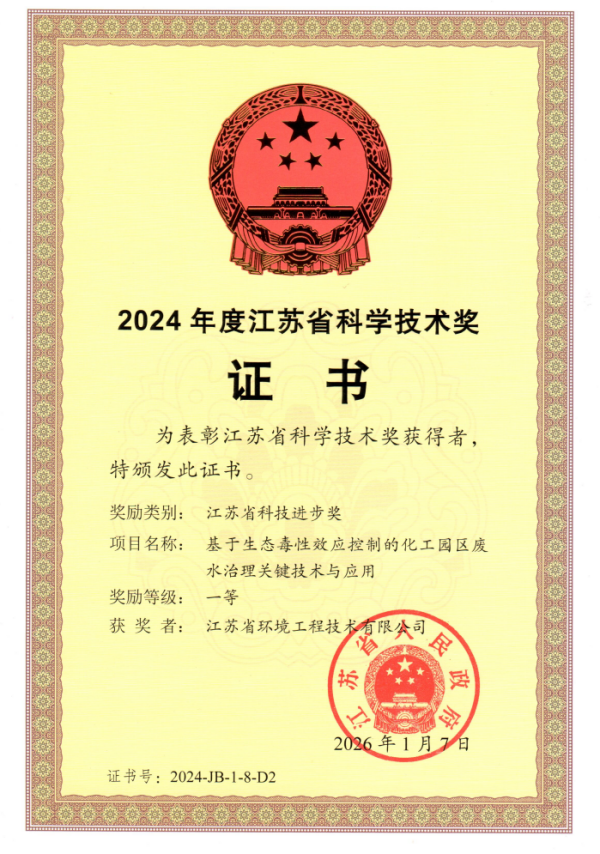 发布日期:2026-02-13 22:08 来源:省环境工程技术有限公司 字体:[ 大 中 小 ]近日,省环保集团所属省环境工程技术有限公司被授予江苏省科学技术奖证书。研究成果“基于生态毒性效应控制的化工园区废水治理关键技术与应用”荣获江苏省科技进步奖一等奖。江苏省科学技术奖是江苏省科技领域的最高荣誉奖,旨在奖励在全省科学技术活动中做出突出贡献的成果,以此推动行业科技进步。